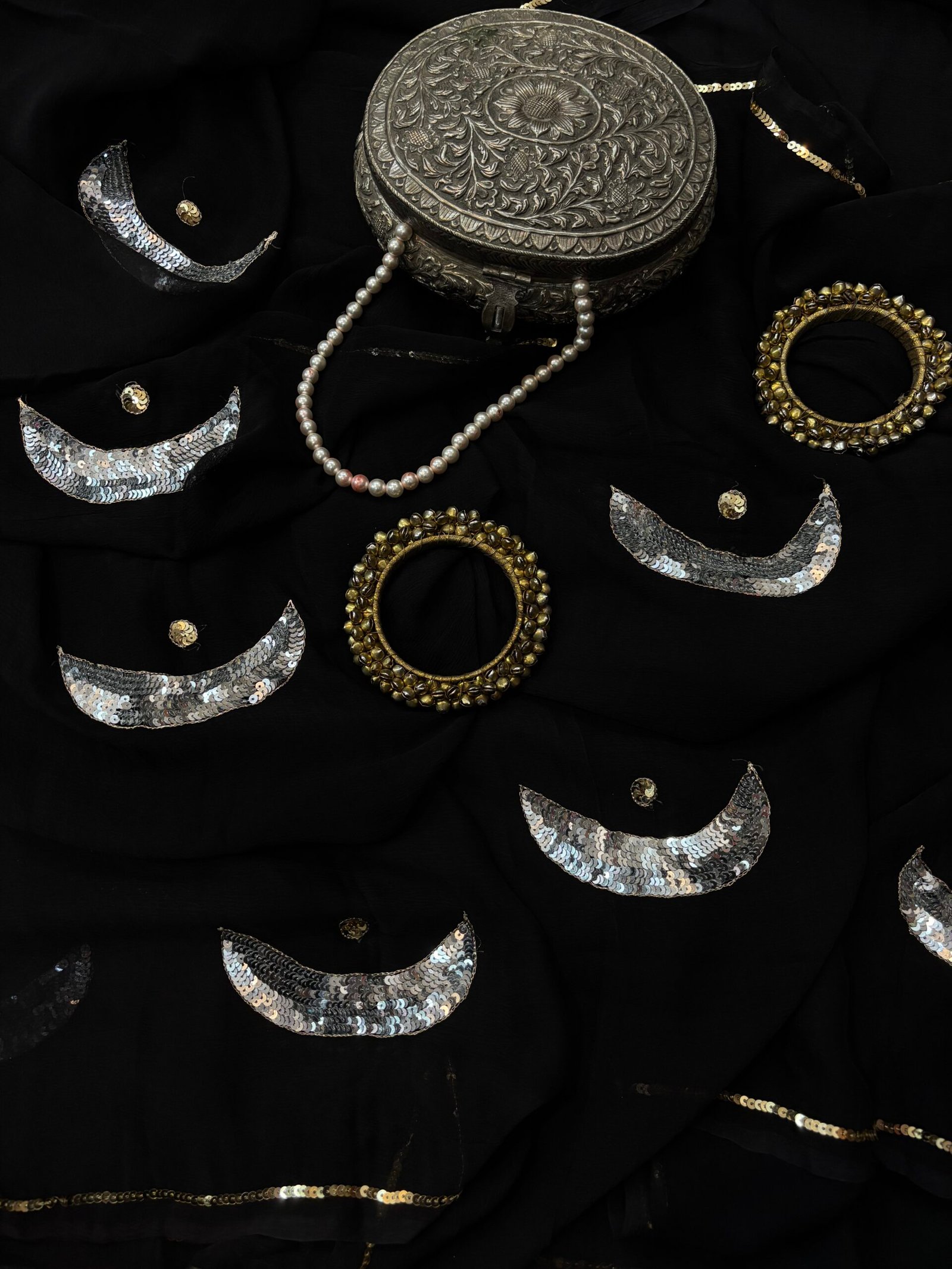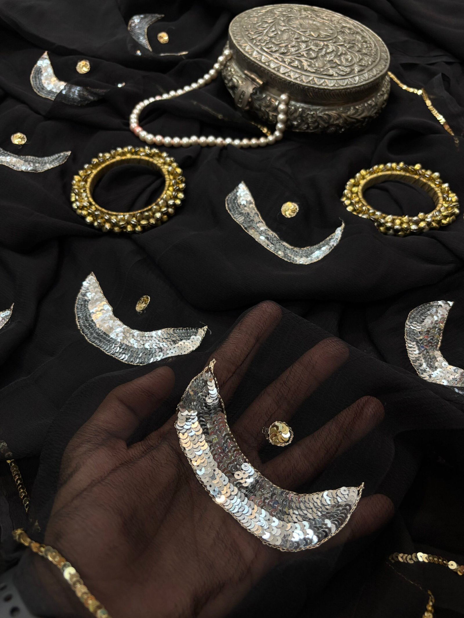 Saree Embroidery: Half moon silver sequins motif