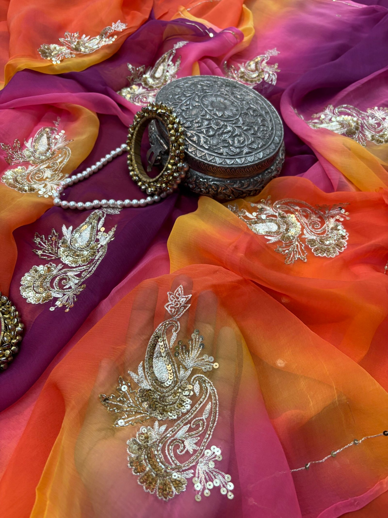 Saree Embroidery: Sequins , zari and kardana paisley style motifs