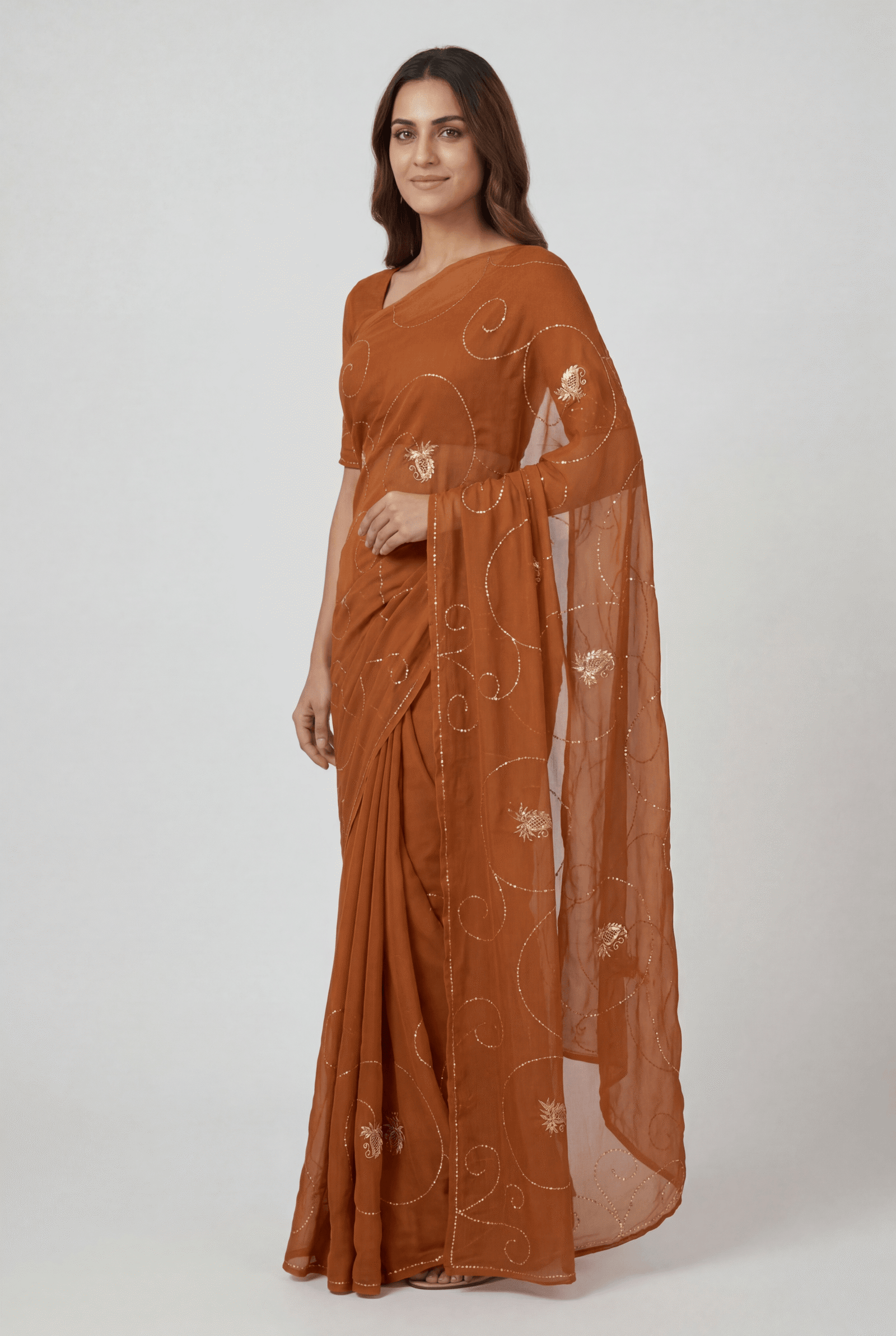Saree Embroidery: Delicate sequins embroidery with flowing swirl jaal and floral paisley cutwork motif